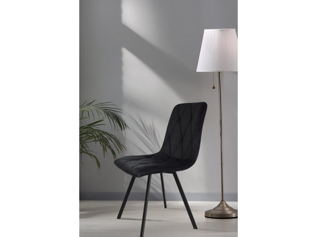 Moderní židle s polstrovanou skořepinou a černou kovovou podnoží.